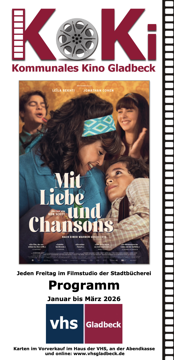 | | | | Das neue KoKi-Programm ab Januar 2026 erscheint am 15. Dezember und liegt dann druckfrisch im Haus der VHS und an zahlreichen weiteren Verteilerstellen im Stadtgebiet aus. Los geht es am Freitag, 9. Januar 2026, mit der aktuellen musikalischen Tragikomödie „Mit Liebe und Chansons“. Außerdem im Programm: Die irische Komödie "Vier Mütter für Edward" (30. Januar 2026), "Ganzer halber Bruder" mit Christoph Maria Herbst (13. Februar 2026) und die himmlische Tragikomödie "Good Fortune – Ein ganz spezieller Schutzengel" (27. Februar 2026). Im Kinderkino zeigen wir u. a. die Fortsetzung der beliebten Kinderbuchverfilmung "Die Schule der magischen Tiere 4" (6. März 2026). In der Reihe "Kult im KoKi" gibt es außerdem ein Wiedersehen mit den "Comedian Harmonists".